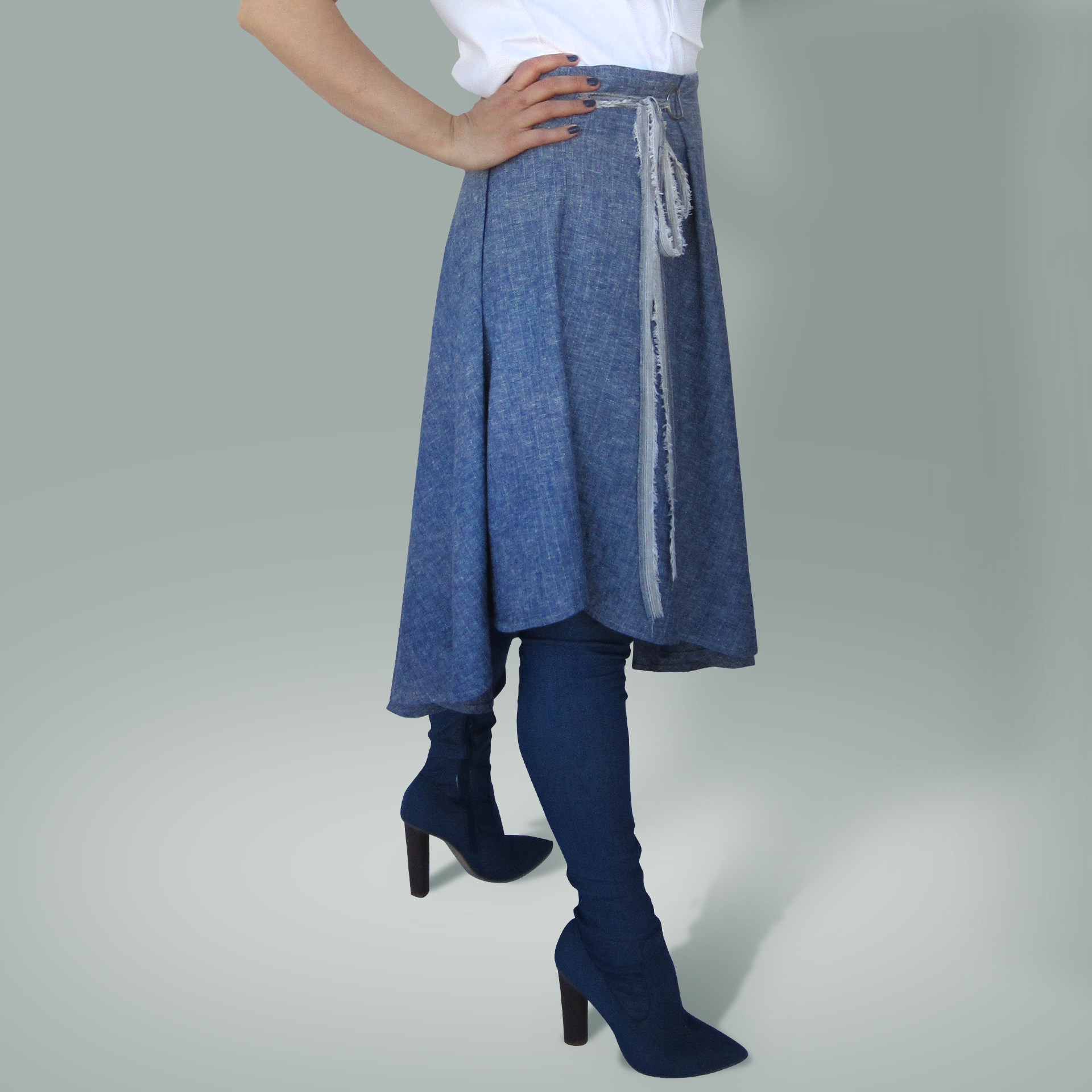 An asymmetric cut skirt made of cotton with adjustable waist.