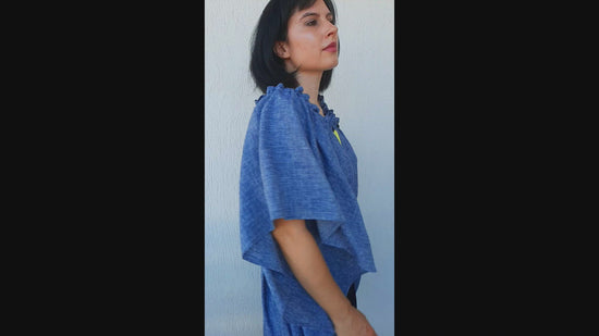 Un design Onna Gall replicat deja in mai multe variante de tesatura. Acest model este realizat din bumbac cu aspect de denim . Are o insertie frontala din triunghi verde olive, se ajusteaza in talie cu un cordon si are nasturei imbracati in tafta neagra. Manecile ample creaza un joc interesant la fel ca aripile unui fluture. De aici si inspiratia pentru denumirea modelului.