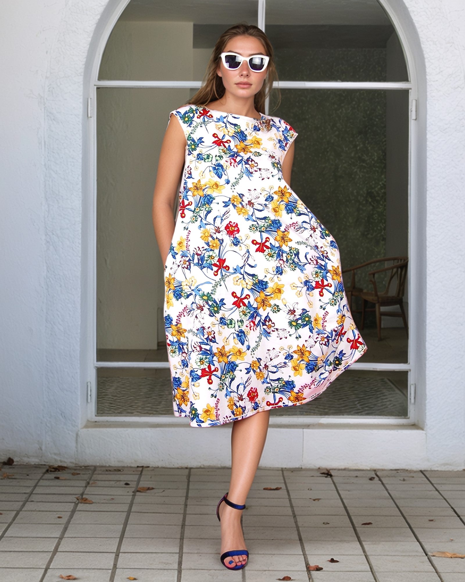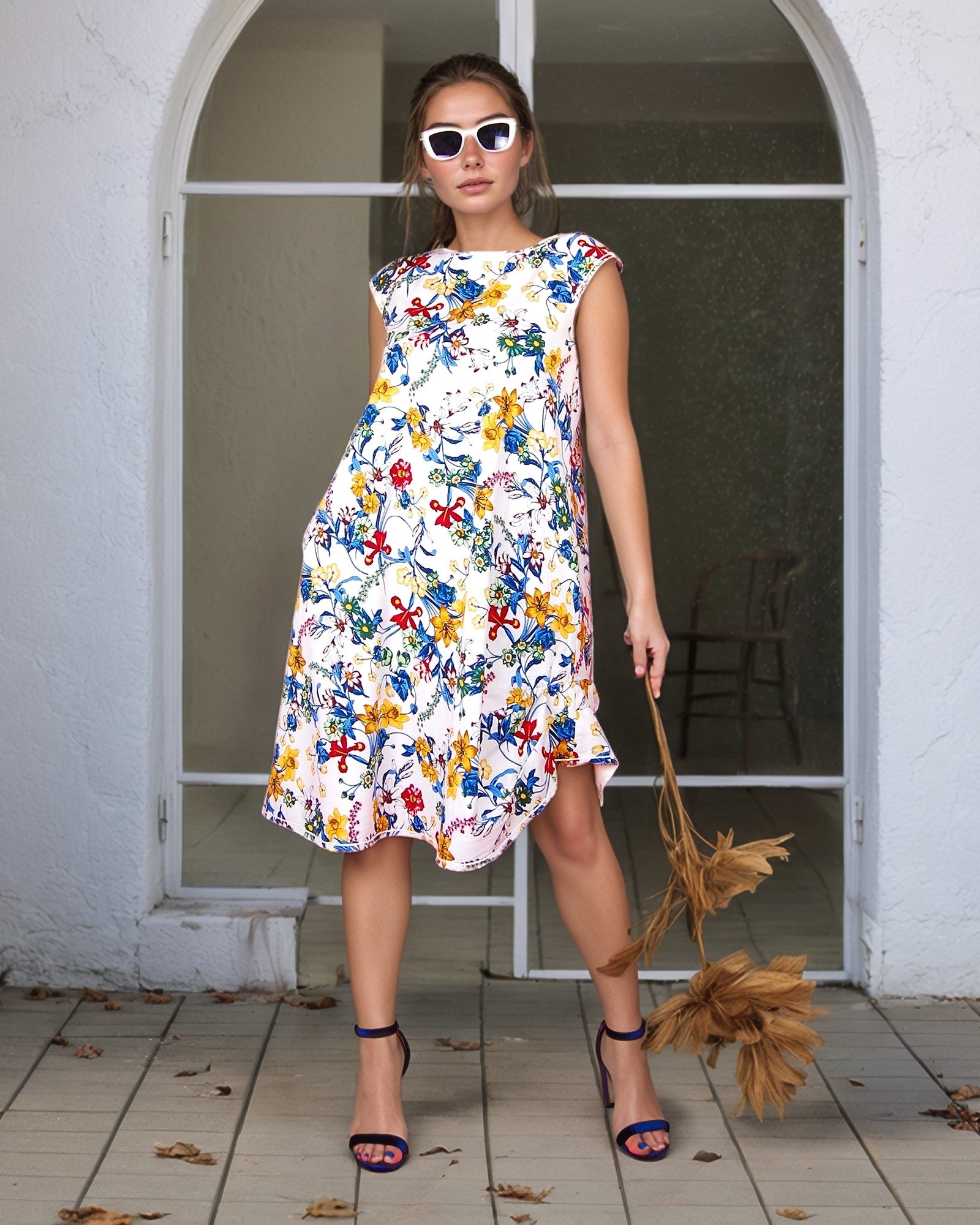 Atât de vesel și frumos este acest bumbac că doar o rochiță lejeră de vară îl pune în evidență. Modelul este accesorizat la mânecuțe, gât și tiv cu șnur alb argintiu decorativ.