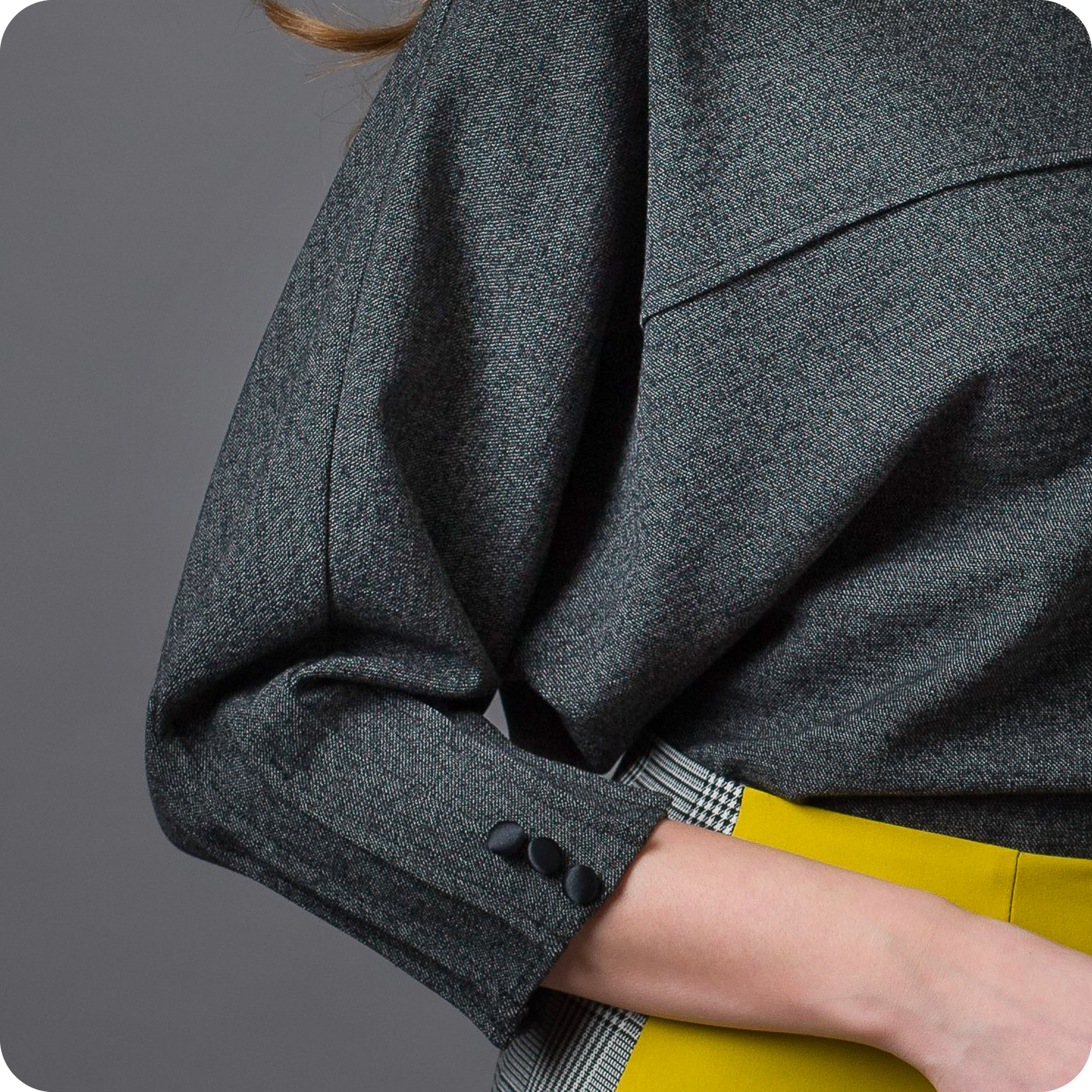 The midi sleeves feature decorative details and shiny black fabric buttons.