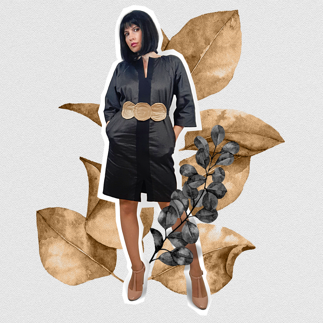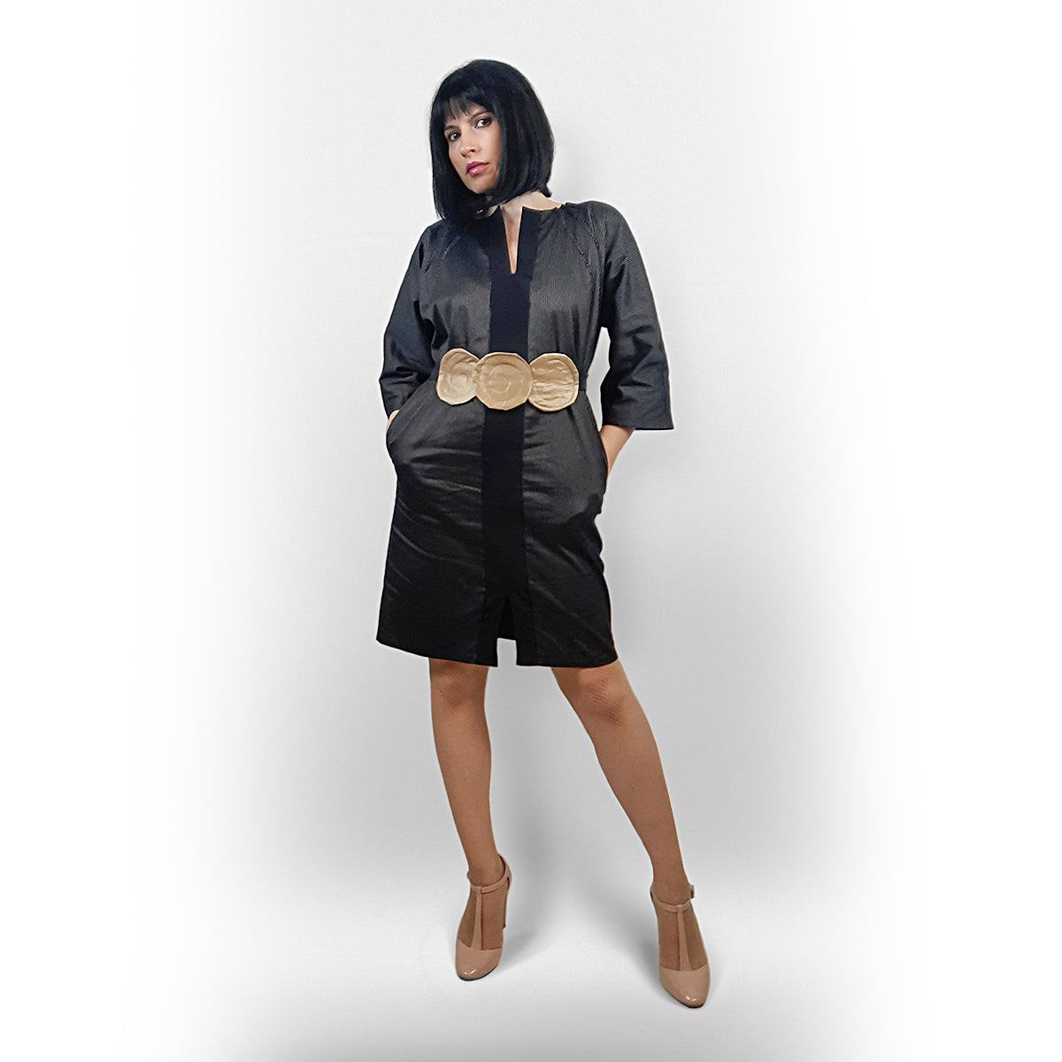 This is a truly versatile design, very stylish with an interesting sexyness. A Kimono inspired dress, made of black cotton with subtile white stripes. The belt is the designer touch and is hand crafted. It's made of shiny taffeta.