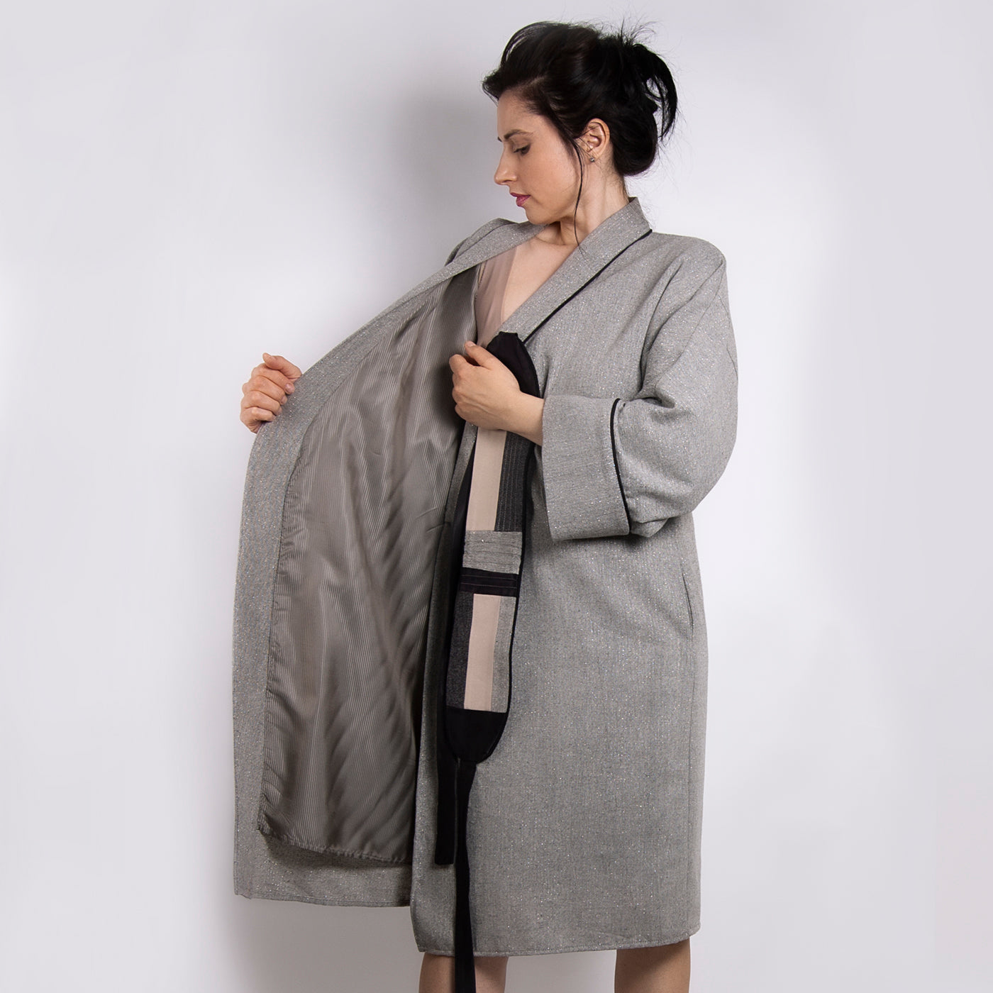 Am realizat din aceasta stofa de lana gri cu insertii argintii un model de kimono pentru sezonul rece, captusit cu tesatura vegetala. Centura este realizata din amestec de mai multe tesaturi si cusaturi decorative, integrand cromatic designul.