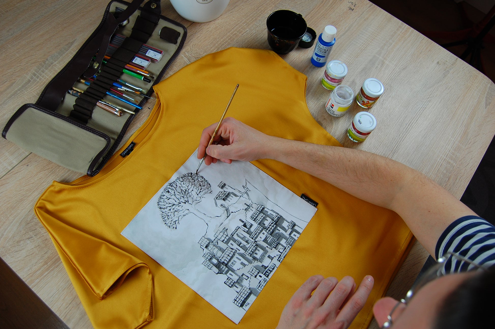 Topul este din tafta aurie, iar pictura este realizata cu culorile speciale textile pe un suport de fibra naturala cu grad de absorbtie mare, astfel incat suporta spalari repetate (30 grade).